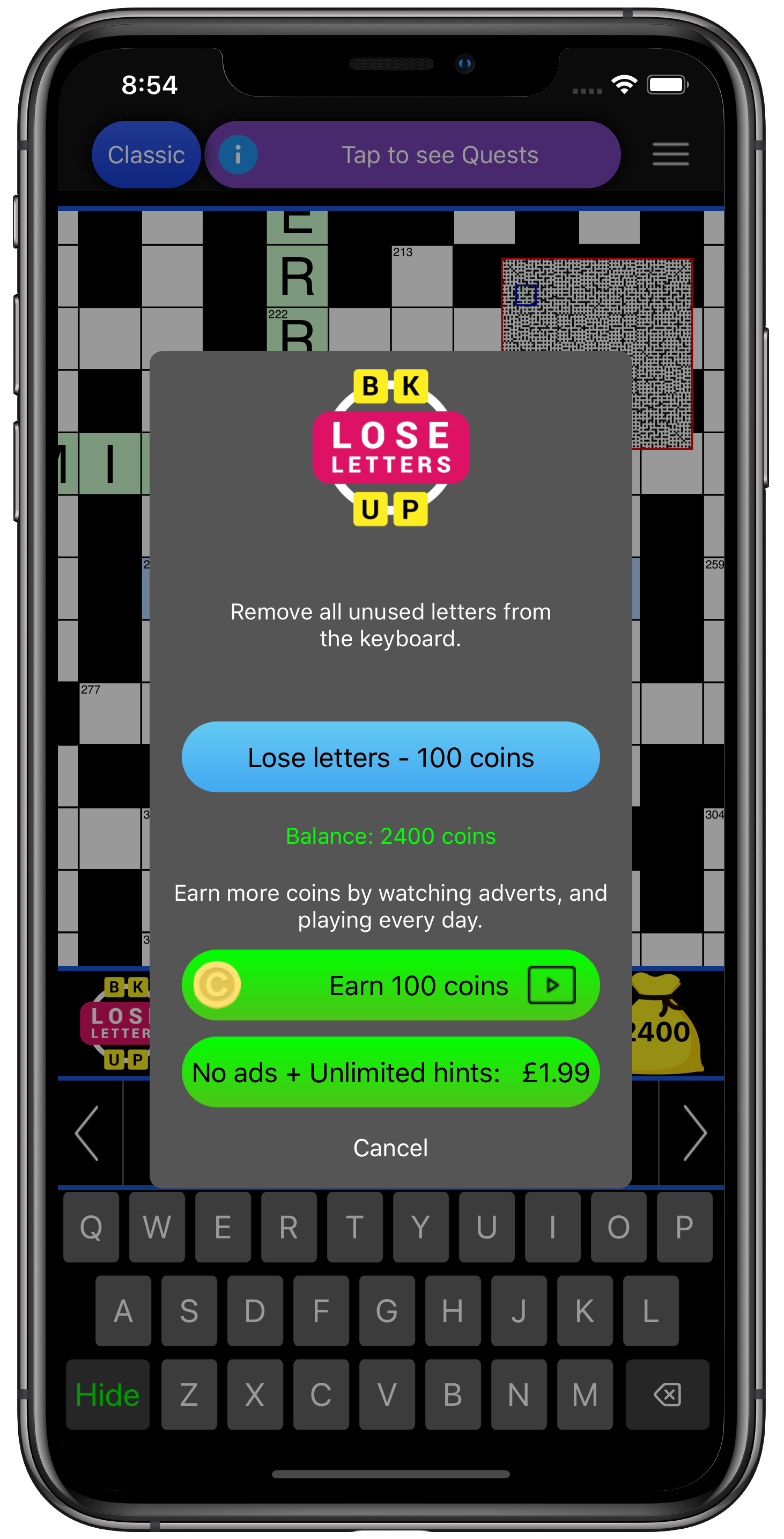 - Hints such as 'Reveal start and end letters', 'Lose unused keyboard letters' and 'Reveal Word'.